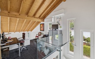 La maison de 201 m2 de surface pondérée a été construite sur une parcelle de choix, avec des matériaux de qualité. Grâce à ses grandes fenêtre en hauteur, son séjour baigne dans la lumière naturelle.