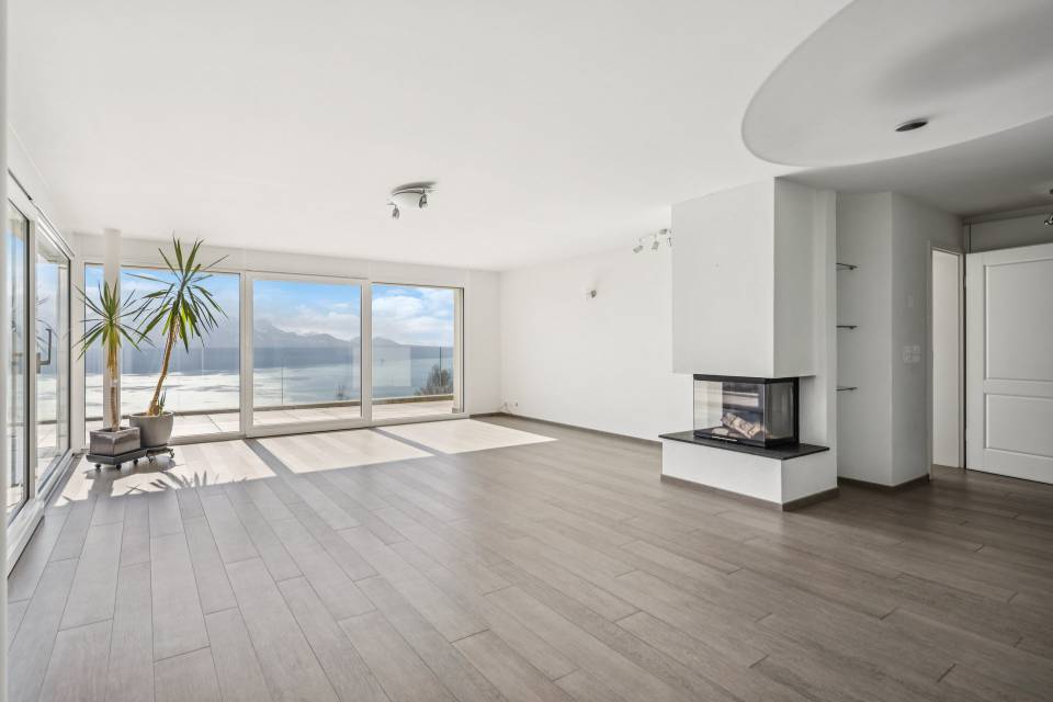 Mit einer Wohnfläche von 145 m² ist diese Wohnung so aufgeteilt, dass die großzügigen Volumen voll ausgenutzt werden können. Sie verfügt über eine 123 m² große Terrasse und einen atemberaubenden Blick auf den Genfer See und die umliegenden Berge.