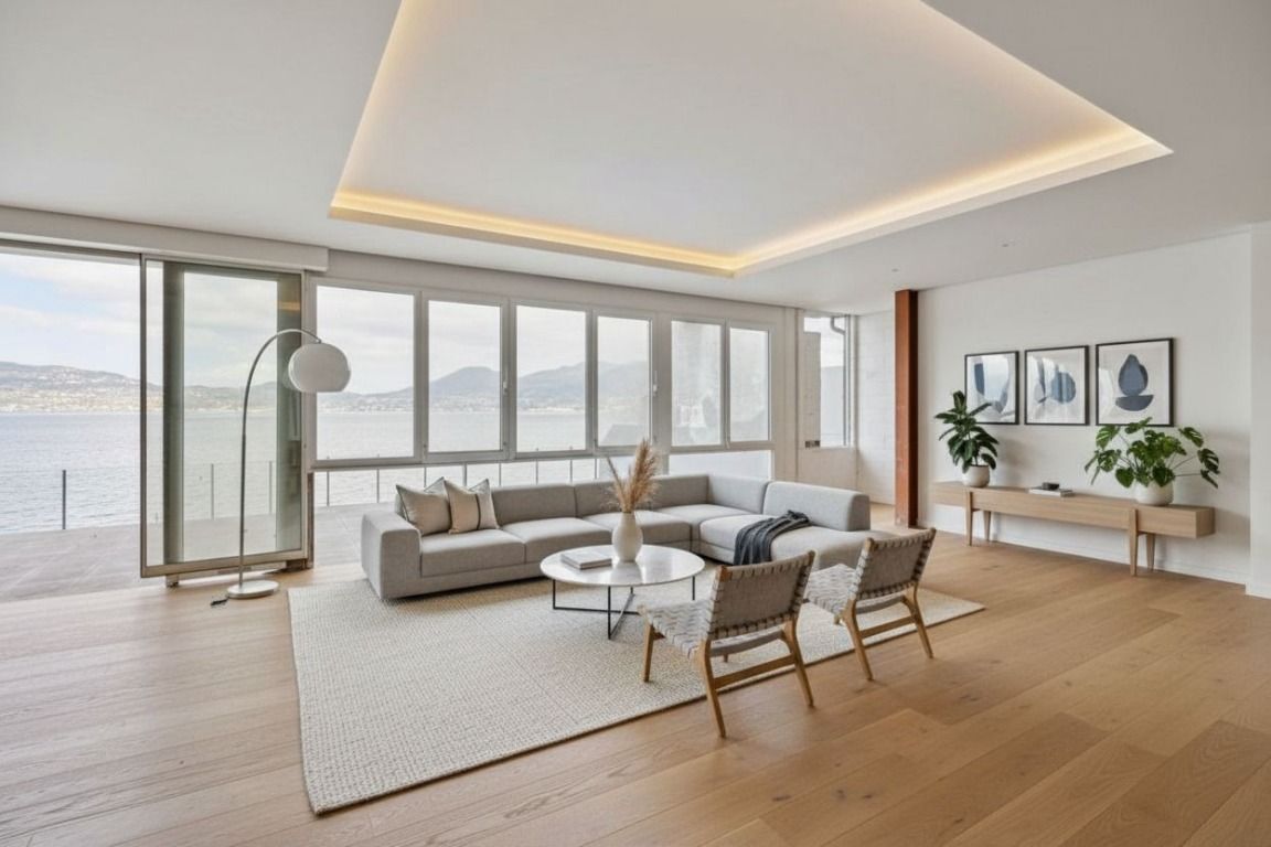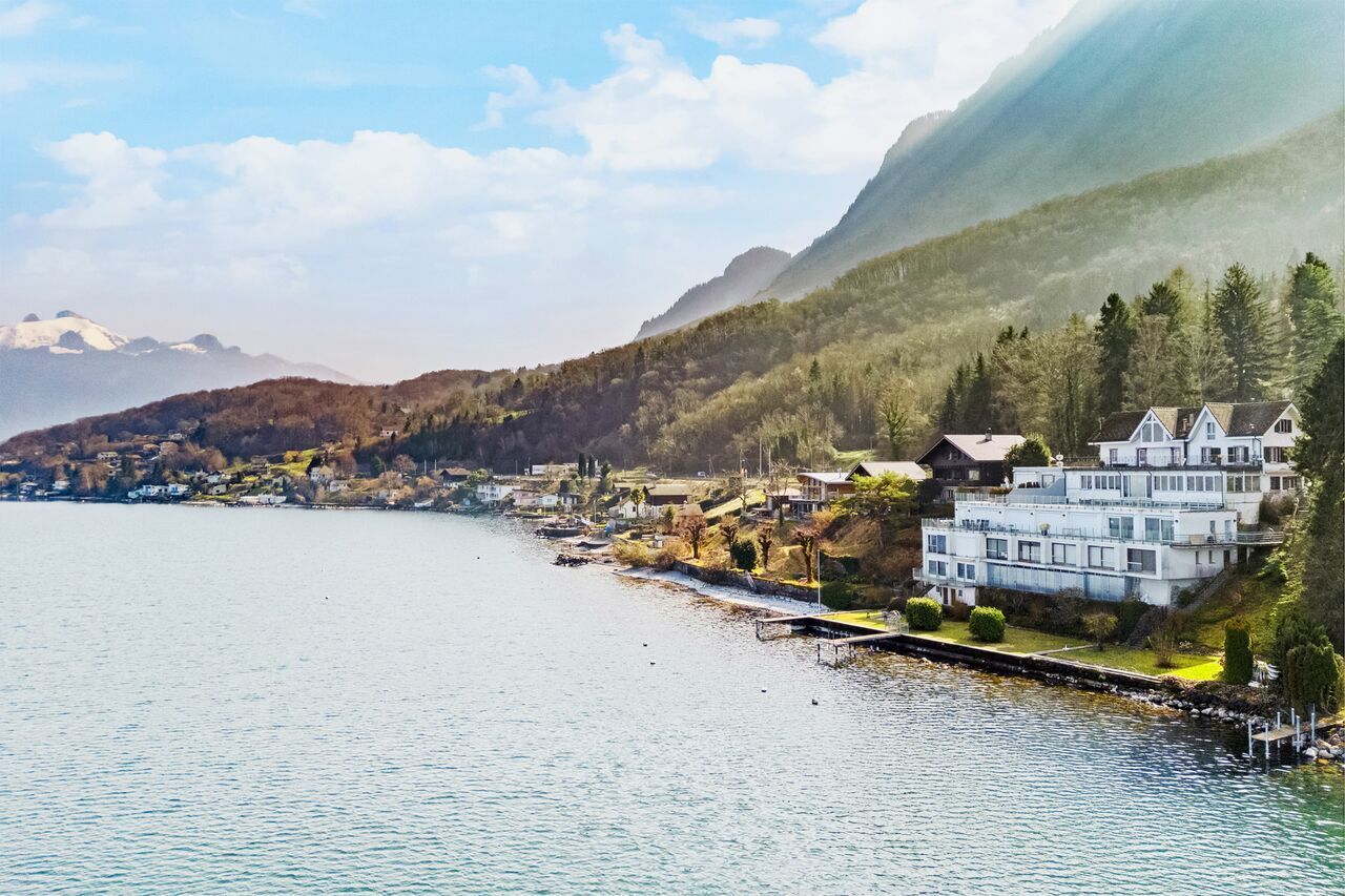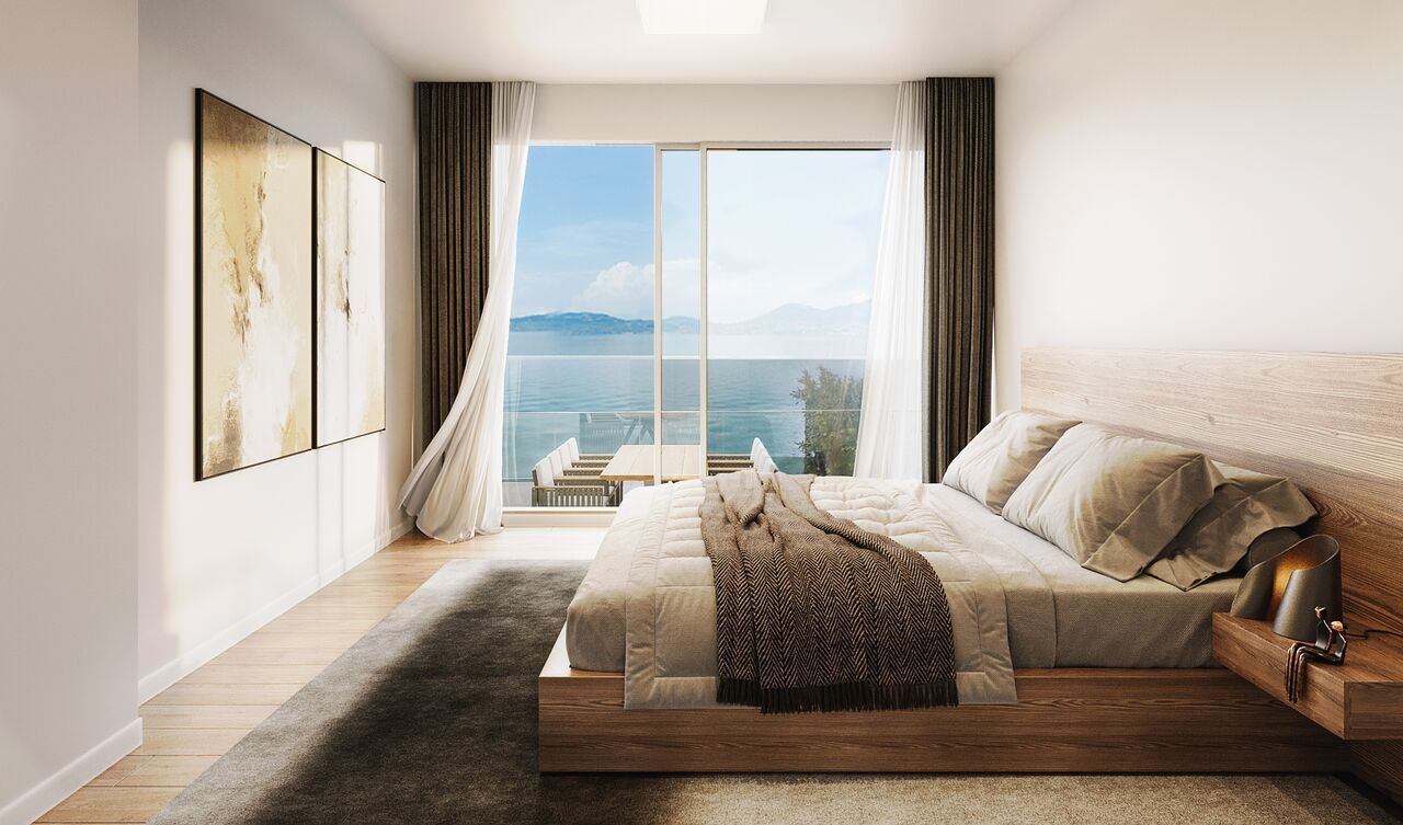 Das Wohnzimmer öffnet sich zu einem offenen Balkon, ideal, um den herrlichen freien Blick auf den See und die Berge in vollen Zügen zu genießen, ein wahres Naturgemälde im Alltag.