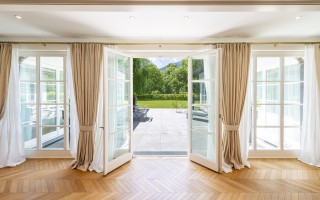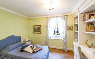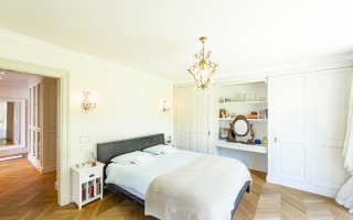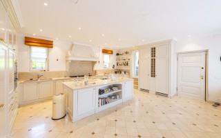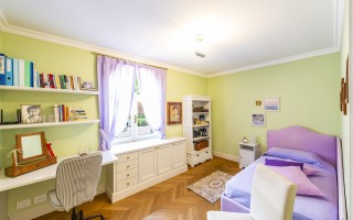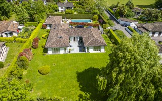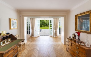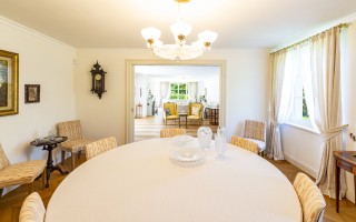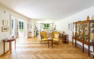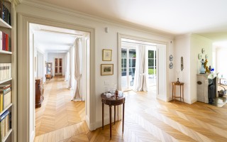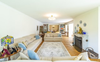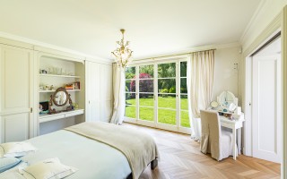 Der Eingangsbereich öffnet sich zu einem imposanten Doppelwohnzimmer mit zentralem Kamin, das eine warme und elegante Atmosphäre schafft und direkten Zugang zum privaten Garten ermöglicht. Die geräumige, funktionale Küche verfügt über einen separaten Eingang sowie eine gut ausgestattete Speisekammer. Der Schlafbereich umfasst eine Hauptsuite mit massgeschneiderter Ankleide und eigenem Bad, zwei Doppelzimmer mit Einbauschränken und ein hochwertig ausgestattetes Gästebad. Zwei weitere Schlafzimmer für Gäste, eines davon mit eigenem Bad en-suite, runden das Raumangebot ab.