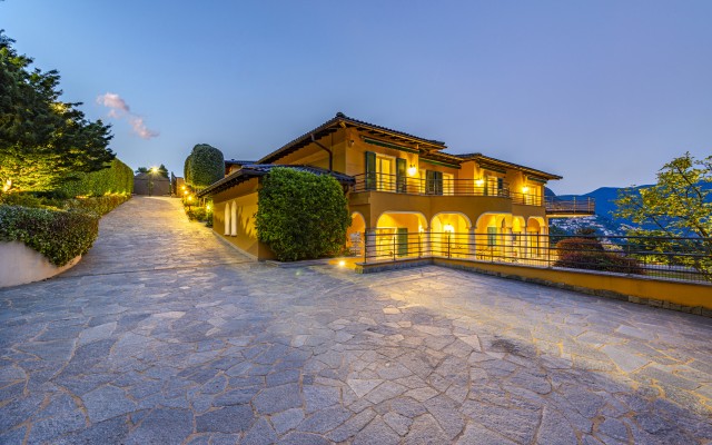 Der Zugang zum Anwesen erfolgt über eine elegante, beleuchtete Privatstraße mit dekorativen Elementen. Das Grundstück von über 3’000 m² umfasst die Hauptvilla sowie ein unabhängiges Gästehaus, eingebettet in einen sorgfältig gepflegten, teilweise terrassierten Garten mit Bewässerungsanlage und stimmungsvoller Beleuchtung.