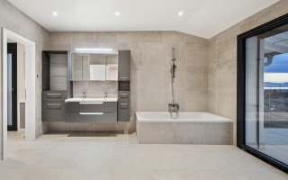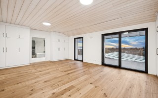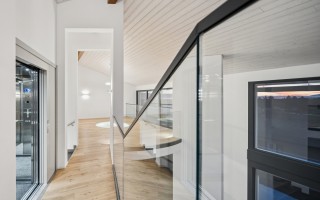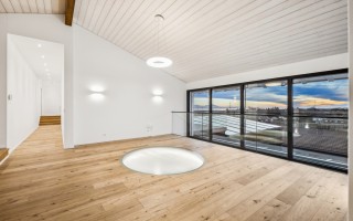 Die 2023 fertiggestellte Villa beeindruckt mit weitläufigen Fensterfronten, außergewöhnlicher Helligkeit und großzügigen Wohnbereichen. Das Erdgeschoss umfasst einen großen Wohn- und Essbereich mit offener Küche, erweitert durch einen Wintergarten sowie ein herrliches, vollständig verglastes Hallenbad. Ein Schlafzimmer und ein Badezimmer vervollständigen diese Etage.