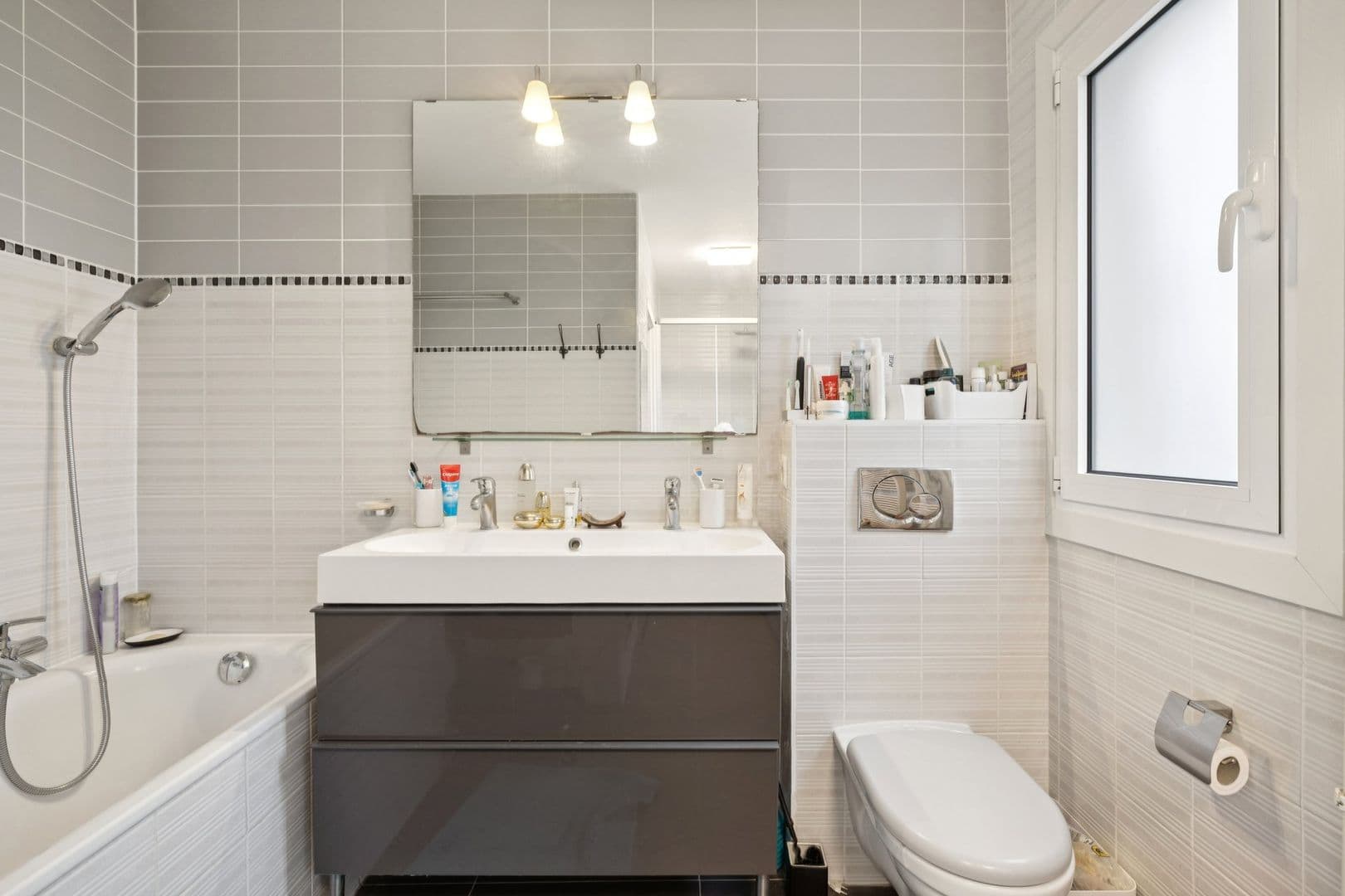 - Familienbadezimmer mit Badewanne, Doppelwaschbecken und WC.