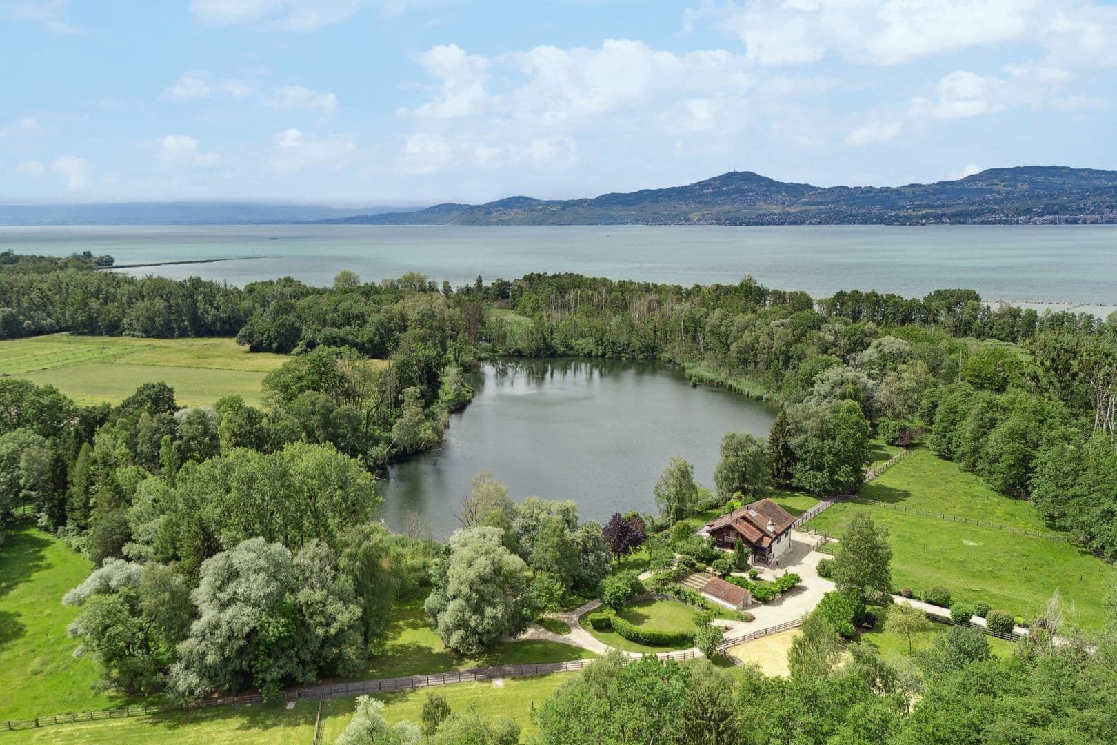Der Zugang zum Anwesen erfolgt über eine für den Verkehr gesperrte Straße, wodurch den Besitzern ein hohes Maß an Privatsphäre garantiert wird. Dieses Reiterhaus ist extrem privat und vermittelt seinen Bewohnern das Gefühl von Abgeschiedenheit, während es gleichzeitig in der Nähe aller Annehmlichkeiten liegt. Eine solche Situation ist in der Schweiz äußerst selten, umso mehr am Rande des Genfersees.