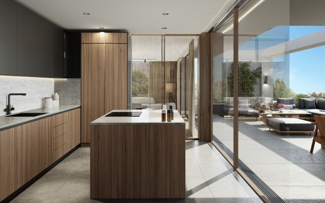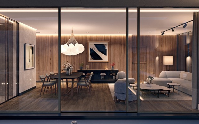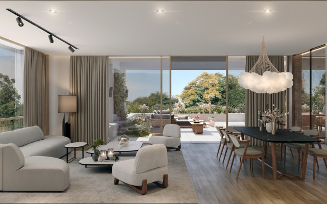 Jede Wohnung, die mit einer hochwertigen Verarbeitung ausgestattet ist, besteht aus einem Wohnzimmer, das sich zum Esszimmer hin öffnet und einen äußerst komfortablen Wohnbereich bietet. Der Holzfußboden verstärkt den warmen Charakter der Räume.