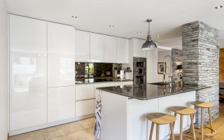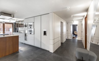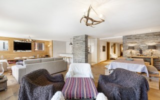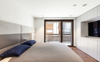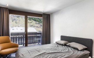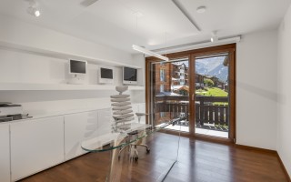 Vom Eingangsbereich der Wohnung sehen Sie direkt in den mit einem Cheminée bestückten Wohnbereich und die offene durch Gaggenau ausgestatte Küche mit Kochinsel, die keine Wünsche übrig lässt. Der Esstisch ist in der Fensternische mit Balkonzugang untergebracht, und bietet die perfekte Aussicht auf den Berg der Berge. Gleich neben dem Eingang und somit hinter dem Wohnzimmer befindet sich das erste von 4 Schlafzimmern, welches in ein kleines aber feines Fitnessstudio mit Technogym Geräten umgewandelt wurde. Im Gang ist zur linken Seite hinter der Küche ein kleines Dampfbad mit Waschturm untergebracht, und rechts befindet sich das separate Badezimmer, welches auch als Gäste-WC dient. Es folgen ein weiteres nach Westen ausgerichtetes Schlafzimmer ebenfalls mit Balkonzugang, und schlussendlich die beiden Südzimmer, wovon das Hauptschlafzimmer ein grosses anliegendes Badezimmer hat, und das andere gegenwärtig als Büro genutzt wird. Beide Räume lassen sich durch eine zusätzliche Türe vom Rest der Wohnung abtrennen. Licht und Storen können über das Mobiltelefon bedient werden.