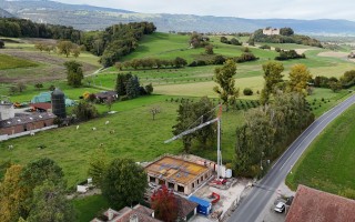 The building is set at the rear of the village, on the edge of an agricultural zone, offering a quiet environment with a unobstructed view over the Orbe plain and the Jura. It includes an elevator, underground parking, bicycle room, common laundry, playground and private cellar per apartment.