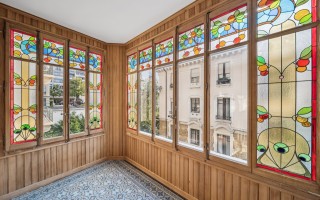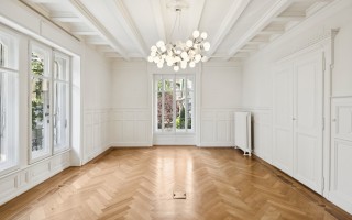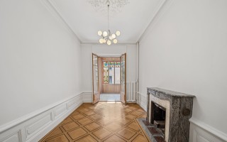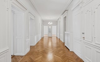 This first floor apartment offers approximately 270 m² of living space, comprising 8.5 rooms, with three balconies totaling about 16.5 m². Original parquet floors, richly decorated ceilings, period fireplaces, and stained-glass windows in the veranda provide incomparable character. Flooded with natural light, the spaces emphasize the remarkable ceiling height. This apartment also includes an attic space under the eaves and a cellar.