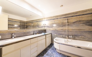 The sleeping quarters include a master bedroom with a lapis lazuli en-suite bathroom (featuring a bathtub and access to the terrace), and a second bedroom with an en-suite bathroom finished in the same fine materials, this time with a shower. A large walk-in wardrobe with built-in closets and a guest WC complete the night area.