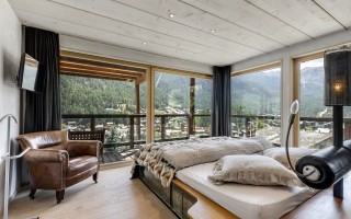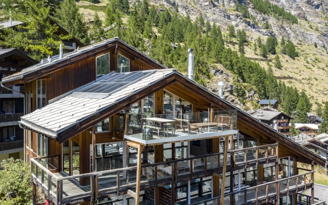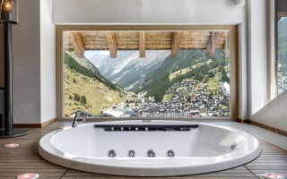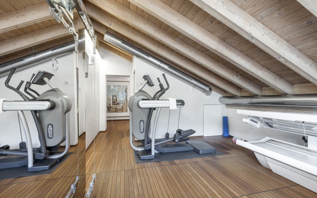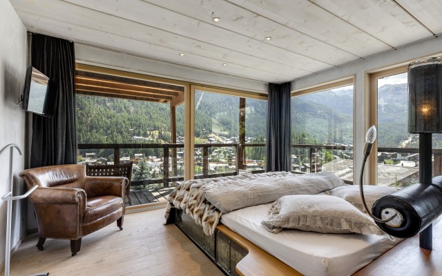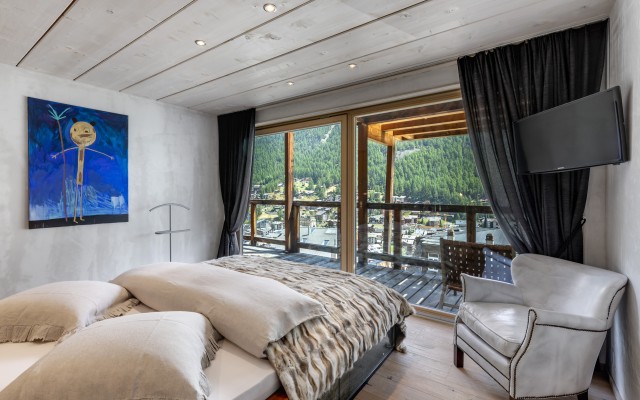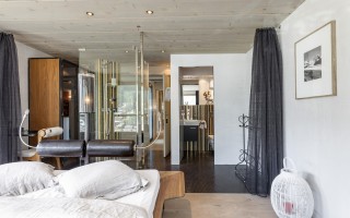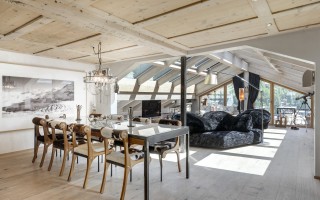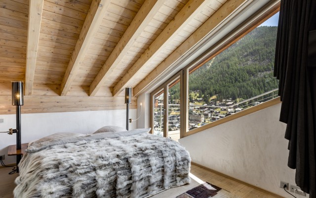 Arriving on the fourth floor, you'll find yourself on the lowest of three levels, divided into a spacious entrance area, three bedrooms with en-suite bathrooms and balconies, a small but perfectly formed fitness room, and a sophisticated wellness area with a jacuzzi, sauna, and steam bath. The fifth floor boasts a light-filled and cozy living area with arguably the most spectacular balcony in all of Zermatt, and an inviting dining area with a kitchen island and bar counter. On the same floor, there are also two bedrooms that share a bathroom with a shower, making them perfect for families visiting. As expected, the master bedroom in the attic leaves nothing to be desired and offers the perfect retreat for your own thoughts.