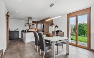 Elle s’étend sur une grande parcelle de 1'101 m2 et offre une surface habitable d'environ 130 m2 répartie sur trois niveaux. Son agencement est particulièrement adapté à une vie de famille, avec un spacieux séjour et une salle à manger lumineux, agrémentés d’une belle cheminée qui permet de chauffer l’ensemble de la maison de manière chaleureuse et économique, en complément du chauffage principal.