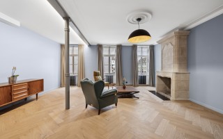 Au premier étage, l’espace de réception s’impose par ses volumes généreux et son élégance intemporelle. Le salon, baigné de lumière, se distingue par son parquet en bois noble et sa cheminée d’époque entièrement restaurée, conférant à la pièce une atmosphère à la fois chaleureuse et raffinée.