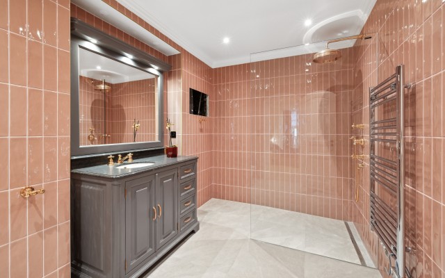 Une première chambre en suite bénéficie d’un dressing privatif et d’une salle de bains raffinée avec douche et toilettes.