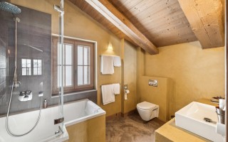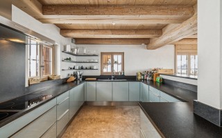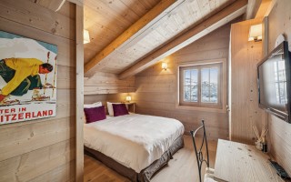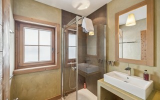 L’ensemble est sublimé par un toit en tavillons de bois, véritable signature montagnarde, qui renforce l’authenticité du chalet et son intégration harmonieuse dans son environnement naturel.