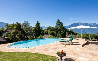 Le parc, redessiné par le célèbre architecte paysagiste Jean Mus, prolonge la villa dans une mise en scène végétale méditerranéenne, ponctuée d’une piscine à débordement suspendue sur le Léman.