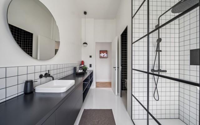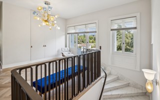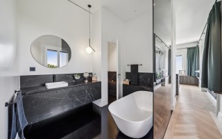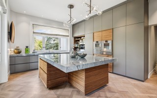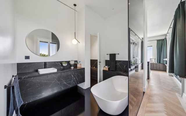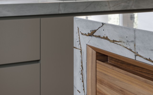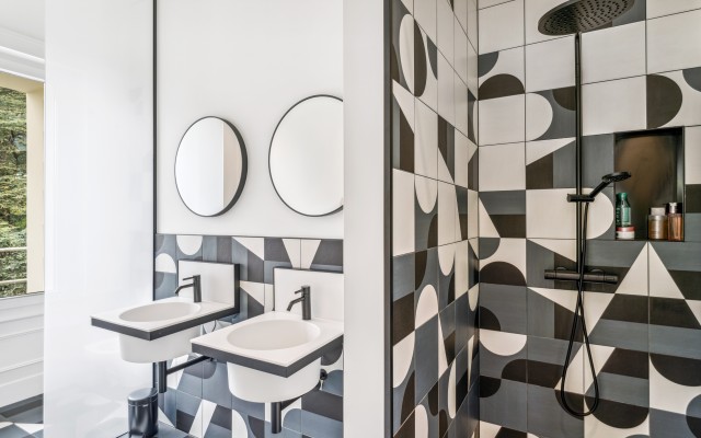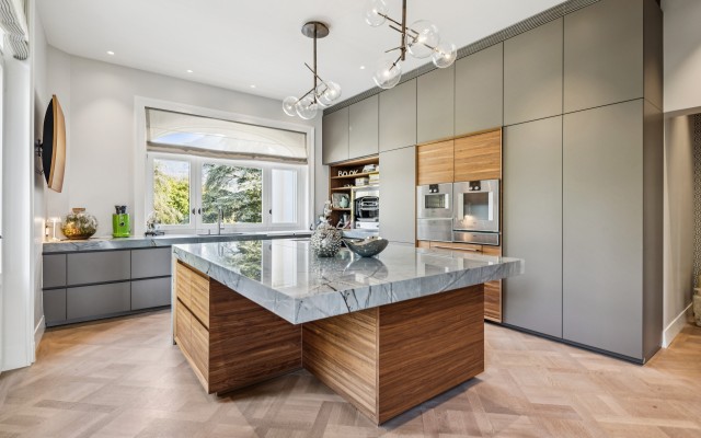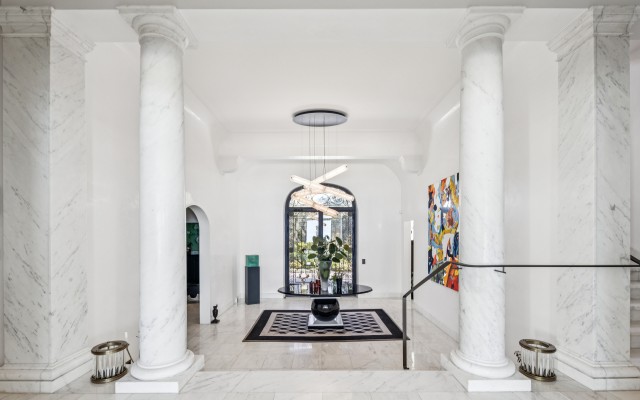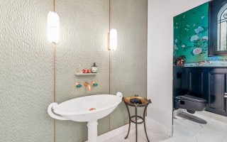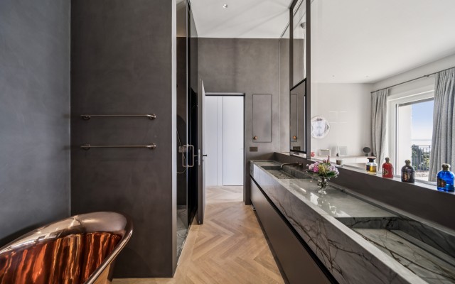 Les intérieurs révèlent une véritable galerie de matériaux précieux, quartzite du Brésil aux nuances profondes, marbres rares, papiers peints artistiques De Gournay, menuiseries artisanales.